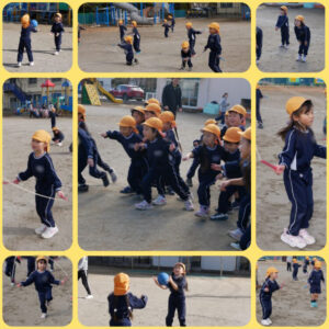 何事にも意欲的にチャレンジするもみじ組「もっと上手になりたい」「もっと○○したい」がいっぱいやりたい!気持ちが強すぎて、最後まで話を聞かずに行動へ!先を見通せるようになった…とも言えますが、あわてんぼうさんも(笑)縄跳び&キャッチボール今日の「縄跳びチャンピオン」つっかえちゃったら座る!跳び続ける友