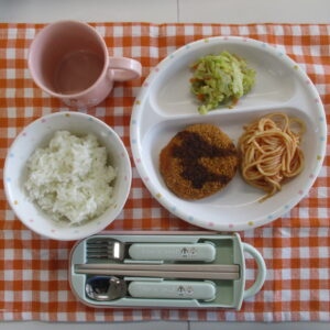 ○ご飯○メンチカツ○ケチャップパスタ○キャベツのサラダ