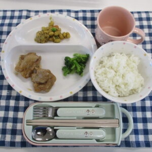○ご飯○照り焼きチキン○ブロッコリー添え○カレービーンズ