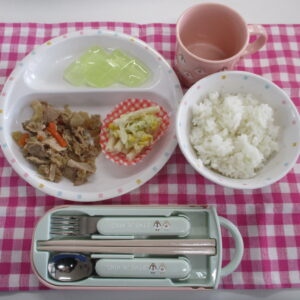 ○ご飯○豚肉と野菜のうま煮○マカロニサラダ○マスカットゼリー