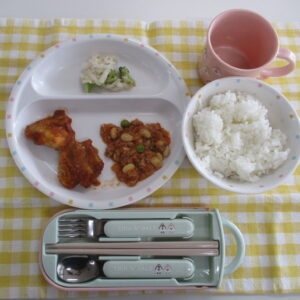 ○ご飯○タンドリーチキン○大豆のチリコンカン○野菜のごま風味サラダ