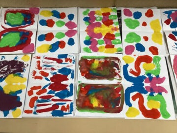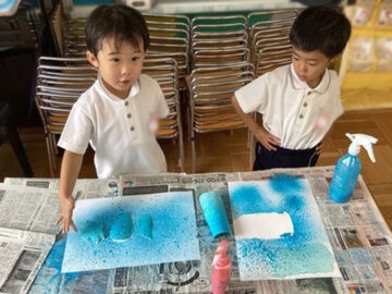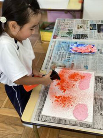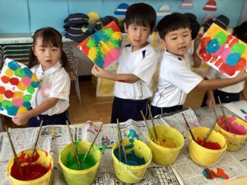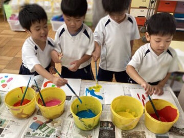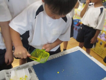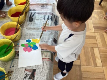 さくらぐみさんともみじぐみさんが絵の具で製作活動