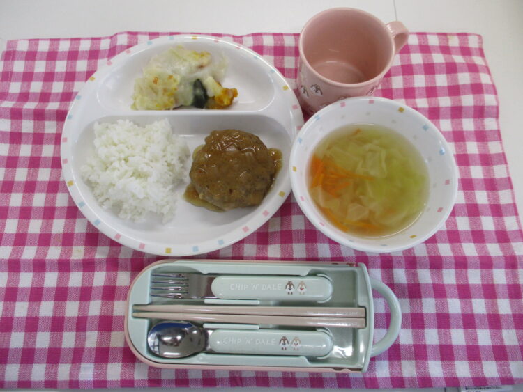 できたての給食を子どもたちへ 2025年10月30日の給食 【🎃ハロウィンメニュー★】 ○ご飯 ○ハンバーグ(オニオンソース) ○パンプキングラタン ○コンソメスープ(キャベツ・人参) 【過去のページへ】